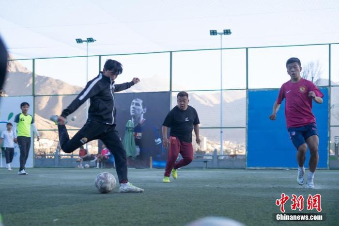 圖為12月12日,拉薩市城關(guān)區(qū)仙足島室外足球場(chǎng)里,市民正在踢球。 中新社記者 貢嘎來(lái)松 攝