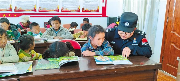 日喀則市曲龍貢達(dá)村駐村工作隊(duì)(西藏邊檢總站派駐)開設(shè)小課堂,為中小學(xué)生免費(fèi)提供制作手工、課外讀物講解等服務(wù)。圖為駐村隊(duì)員劉海鵬為學(xué)生講解課外讀物。記者 盧文靜 攝
