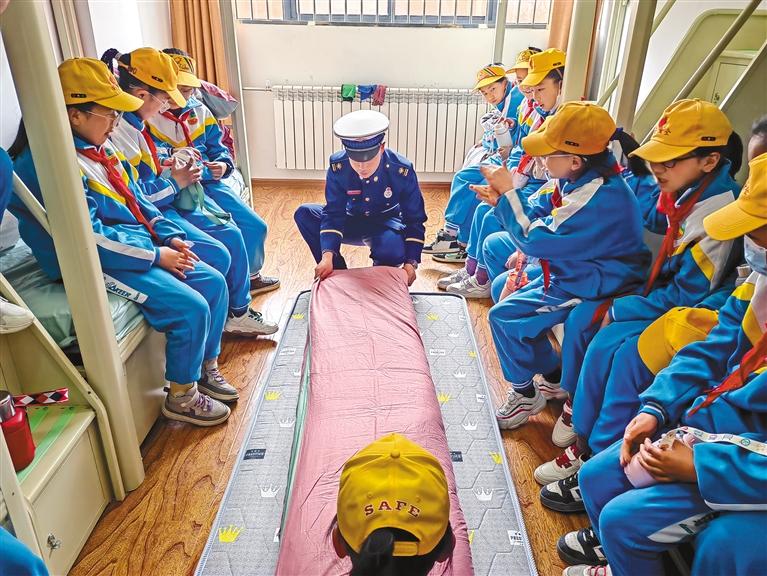拉薩市森林消防大隊隊員在教學(xué)生疊被子。記者 格桑倫珠 盧文靜 攝