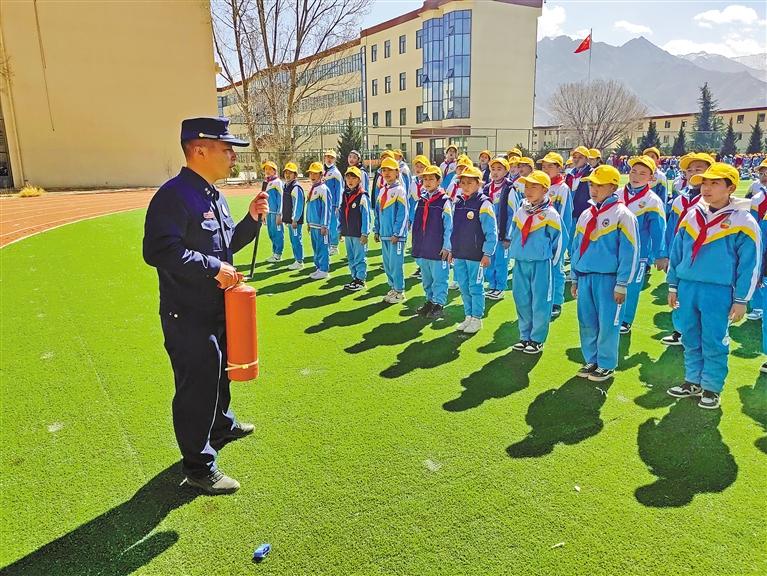 拉薩市森林消防大隊隊員在為學(xué)生講解如何使用滅火器。記者 格桑倫珠 盧文靜 攝