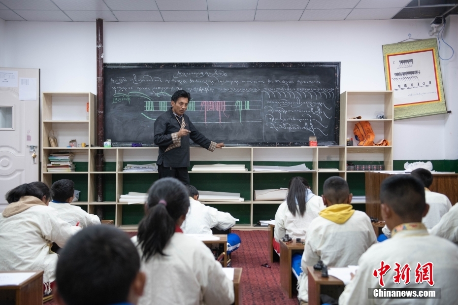5月7日,西藏山南市,加查縣中學藏文書法興趣班的教師扎西達瓦給學生們上課。該興趣班由2名藏文教師任教,每周兩課時,利用自習課或晚自習時間為學生和教師授課。課程內(nèi)容包含執(zhí)筆、運筆、姿勢等基礎書寫技能,以及藏文中的烏金體、珠擦體、簇仁體、簇通體等各類字體的書寫方法。