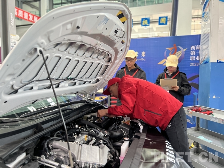 圖為參賽選手進(jìn)行汽車維修項(xiàng)目比賽 攝影:德吉卓瑪
