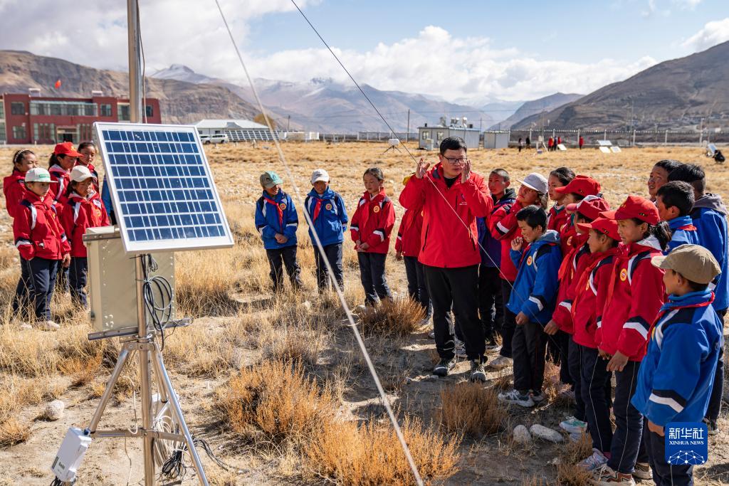 5月15日,珠峰站工作人員席振華給孩子們講解科學(xué)儀器的功能作用。新華社記者 晉美多吉 攝