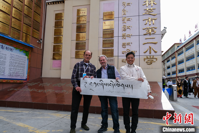 圖為5月18日,柯馬凱(左一)在林芝市第二小學(xué)參訪時獲得學(xué)校贈予的藏文書法作品“扎西德勒”。 中新社記者 江飛波 攝