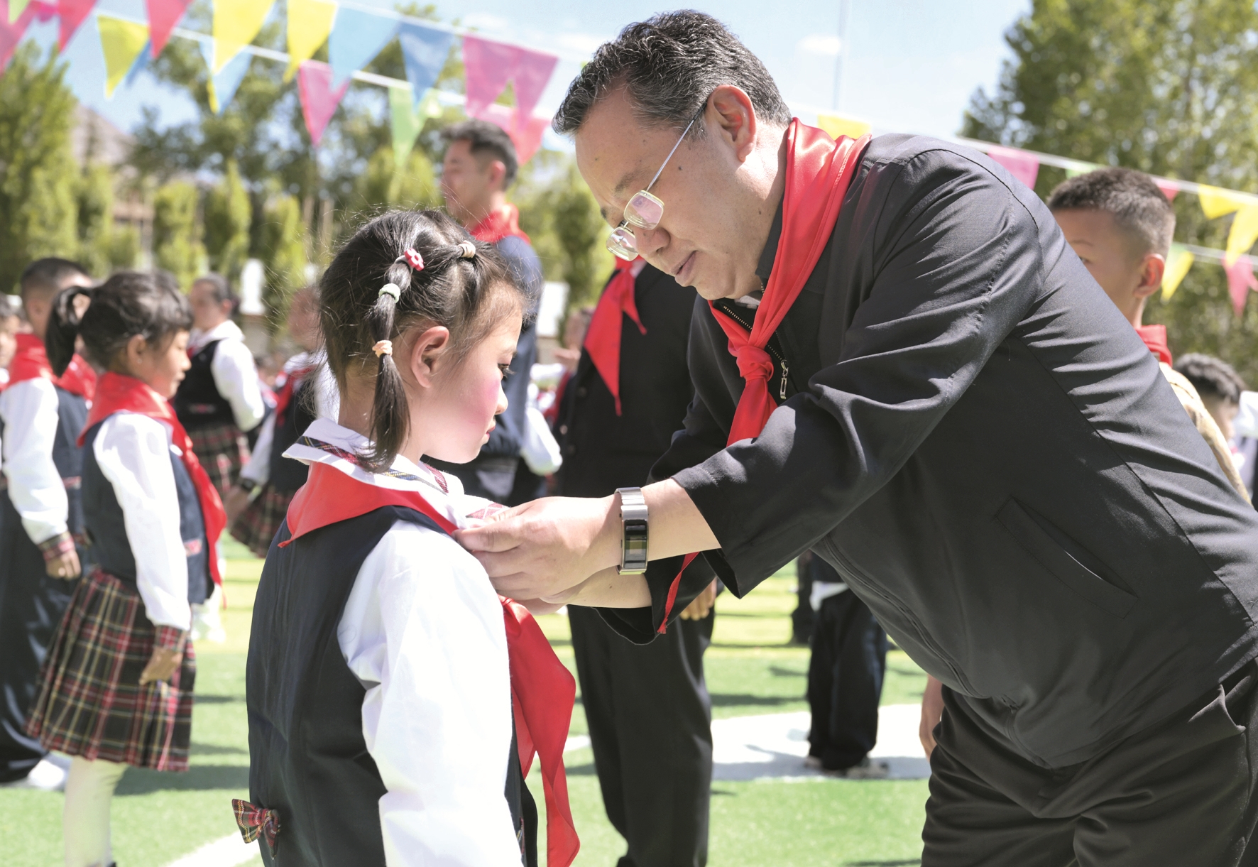 6月1日,西藏自治區(qū)黨委常委、市委書記普布頓珠來到市實(shí)驗(yàn)小學(xué)、實(shí)驗(yàn)幼兒園走訪慰問。這是普布頓珠在市實(shí)驗(yàn)小學(xué)為少先隊(duì)新隊(duì)員授紅領(lǐng)巾。拉薩融媒記者 貢覺群培攝