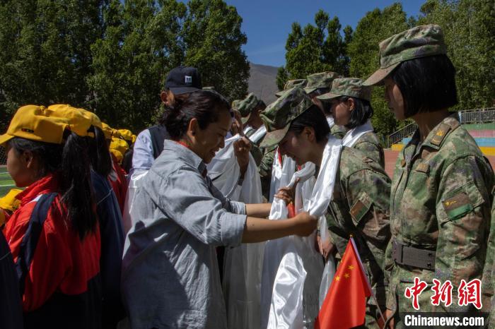 圖為該小學(xué)老師為女兵獻(xiàn)上哈達(dá)表示感謝?!≈煺z