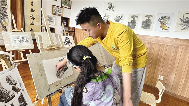 “‘西瓜老師’,這個面包是我特意帶給你的,你餓的時候一定吃?!薄啊鞴侠蠋煛憧次医裉飚嫷迷趺礃??有沒有進(jìn)步?”“‘西瓜老師’,這個地方我不會畫,你能不能教教我?”……課余時間里,陳寶佳經(jīng)常和孩子們一起玩耍,慢慢就成為了孩子們的好朋友。陳寶佳說:“雖然平時會和他們在一起說說笑笑,但是上課的時候我還是比較嚴(yán)厲的。我主要帶素描課,要引導(dǎo)孩子們打好繪畫基礎(chǔ)、練好基本功,今后他們才能在繪畫方面有更多的發(fā)展??吹胶⒆觽儺嫯嬘羞M(jìn)步的時候,我會覺得很幸福?!?/p>