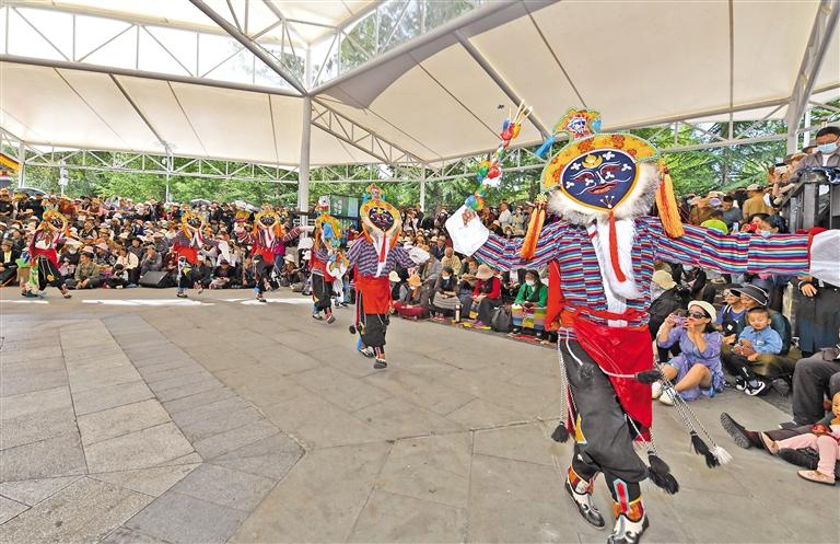 16日上午,在拉薩市宗角祿康公園,演員為觀眾表演藏戲。記者 唐斌 王敏 攝