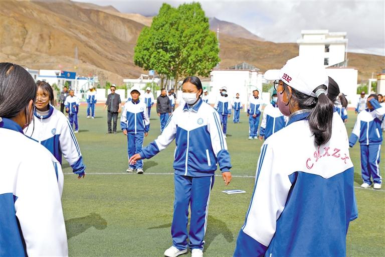 圖為措美縣中學(xué)學(xué)生在操場(chǎng)上跳“熱巴吉念”元素課間操。記者 巴桑旺姆 攝