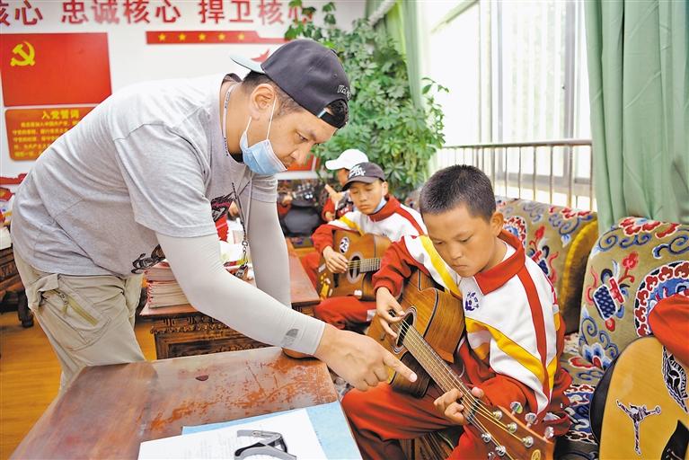 拉薩市第四中學(xué)的老師指導(dǎo)學(xué)生學(xué)習(xí)吉他彈奏。記者 王敏 攝