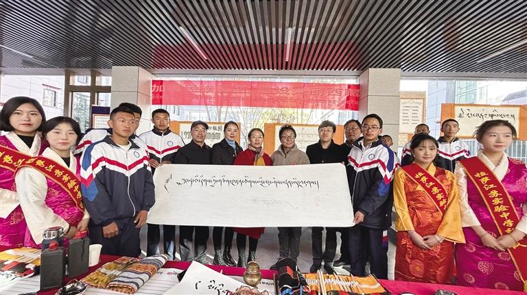 隨后,與會(huì)領(lǐng)導(dǎo)向江蘇實(shí)驗(yàn)中學(xué)贈(zèng)送了150套民族團(tuán)結(jié)進(jìn)步教育讀本。大家一同觀看了書畫社同學(xué)現(xiàn)場(chǎng)進(jìn)行的民族團(tuán)結(jié)進(jìn)步書畫作品創(chuàng)作。中國書協(xié)會(huì)員、自治區(qū)政協(xié)委員、拉薩市政協(xié)常委、區(qū)市書協(xié)副主席南杰旺扎現(xiàn)場(chǎng)創(chuàng)作了“鑄牢中華民族共同體意識(shí)”的藏文書法橫幅贈(zèng)送給江蘇實(shí)驗(yàn)中學(xué)。