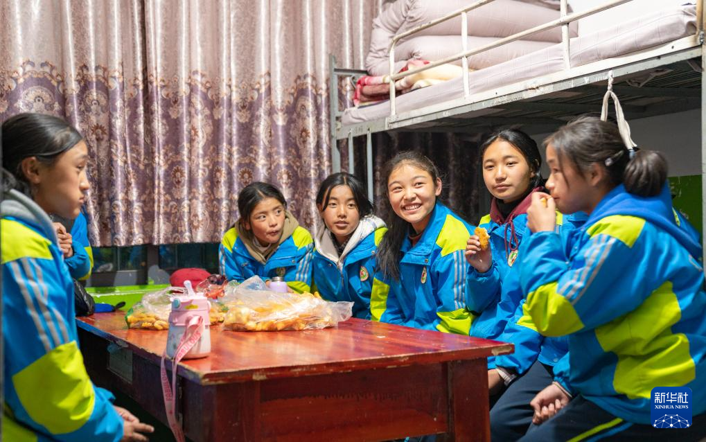斯曲卓瑪(右三)和同宿舍的朋友一起吃零食聊天(11月9日攝)。新華社發(fā)(丁增尼達 攝)