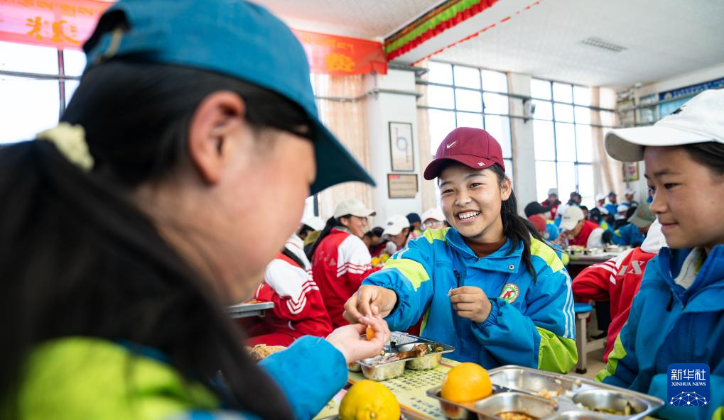 斯曲卓瑪(中)在學(xué)校吃午餐(11月10日攝)。新華社發(fā)(丁增尼達 攝)