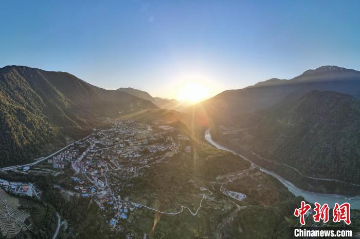 圖為12月19日傍晚,西藏林芝市墨脫縣城日落風光,畫面右側(cè)為雅魯藏布江。(無人機畫面)中新社記者 江飛波 攝