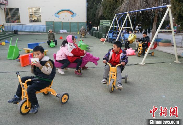 12月20日,青海省海東市民和縣中川鄉(xiāng)美一小學(xué)安置點(diǎn)內(nèi)兒童嬉戲?!●R銘言 攝