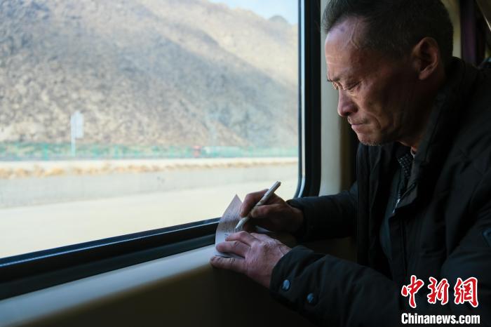 2月1日,Z166次列車上,返鄉(xiāng)的魏恩銀在填寫“旅客健康登記卡”,這是高海拔青藏鐵路上旅客獨(dú)有的健康登記措施。 中新社記者 江飛波 攝