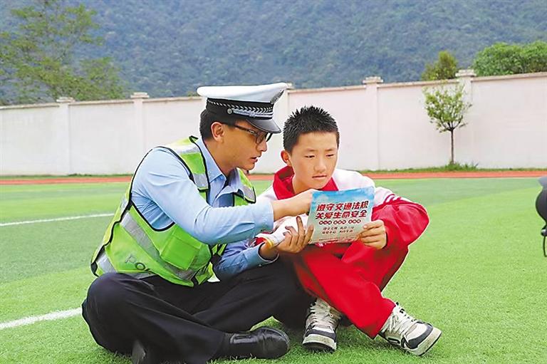 圖為交警向?qū)W生講解交通安全知識。記者 彭琦 攝