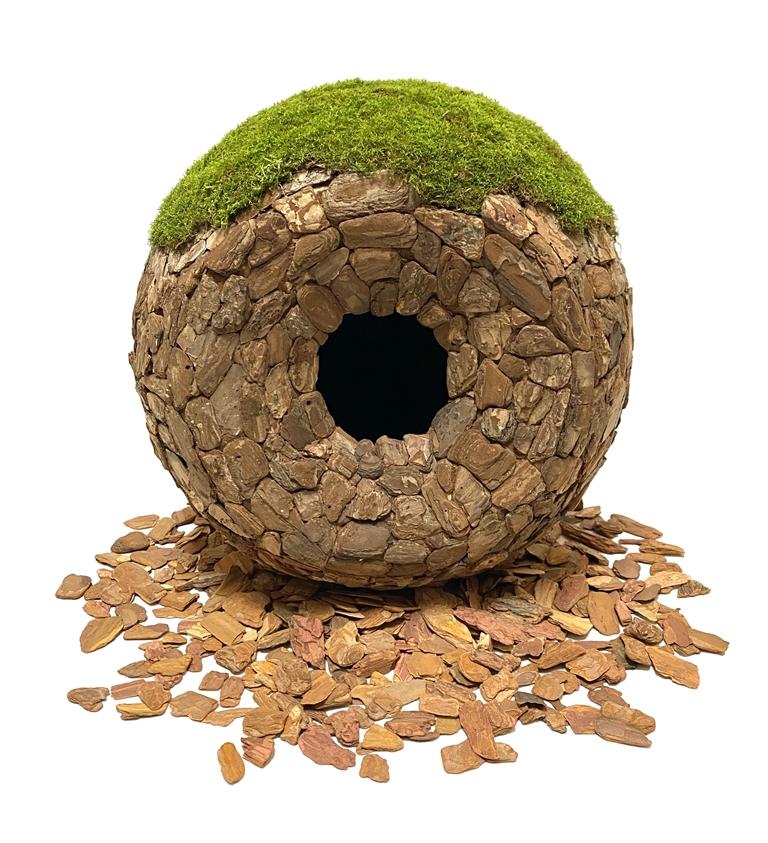 嘎瑪次仁的作品聚焦生態(tài)環(huán)境,作品《意象·自然》,是對“自然”理解的一種概念性的抽象表達。其形式上為一個中空球形裝置,表面為拼貼的樹皮,頂部種植有苔蘚。正面的部分區(qū)域內(nèi)陷,中間為一孔洞,為了更凸顯出洞中的“黑暗”與“未知”,內(nèi)部涂有特殊啞光涂料。為了體現(xiàn)出“生命感”,他在作品內(nèi)部安裝了感應發(fā)聲裝置,感知到人靠近后會發(fā)出輕微的心跳聲。