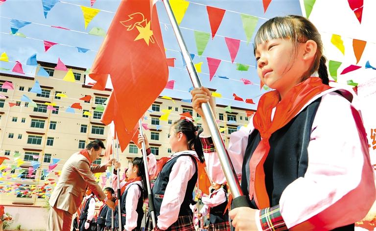 5月30日,拉薩市在實(shí)驗(yàn)小學(xué)東城分校舉行以“紅領(lǐng)巾愛祖國”為主題的一年級新隊(duì)員入隊(duì)儀式暨“紅領(lǐng)巾獎(jiǎng)?wù)隆蔽逍钦骂C章儀式。儀式現(xiàn)場,老隊(duì)員們鄭重地為新隊(duì)員佩戴紅領(lǐng)巾,大隊(duì)輔導(dǎo)員帶領(lǐng)新老隊(duì)員宣讀入隊(duì)誓詞,隊(duì)員們激情唱響《我們是共產(chǎn)主義接班人》,嘹亮的歌聲在校園回蕩。