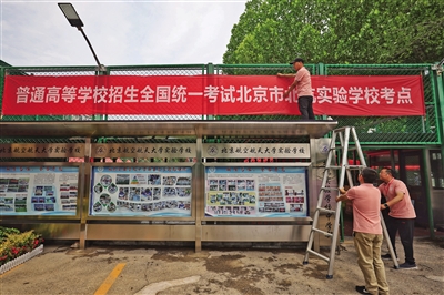 6月6日,記者在北京航空航天大學(xué)實(shí)驗(yàn)學(xué)校中學(xué)部(簡(jiǎn)稱“北航實(shí)驗(yàn)學(xué)?!保┛键c(diǎn)看到,學(xué)校西門(mén)處已懸掛起高考考點(diǎn)橫幅、考場(chǎng)布置已就位,校園內(nèi)放置了多個(gè)溫馨的提示語(yǔ)標(biāo)牌。據(jù)悉,該校是今年新增高考考點(diǎn)之一,承接來(lái)自9所學(xué)校277名考生的高考組考任務(wù)。此外,記者還探訪了北京高考人大附中經(jīng)開(kāi)學(xué)校考點(diǎn)
