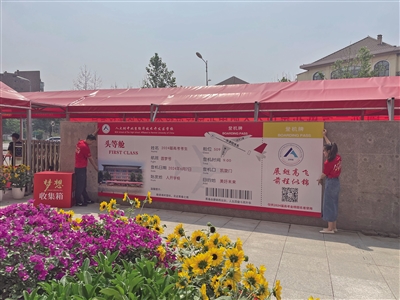 “2024高考加油”“高考就是高高興興地考試”“保持靜心,增強(qiáng)信心,做題專心,考試細(xì)心”……考生一進(jìn)考點(diǎn),就可以看到這些鼓舞人心的標(biāo)語(yǔ)。走出考點(diǎn)時(shí),一張巨型“圓夢(mèng)號(hào)”頭等艙登機(jī)牌映入學(xué)生眼簾,祝??忌鷤冋钩岣唢w,前程似錦。