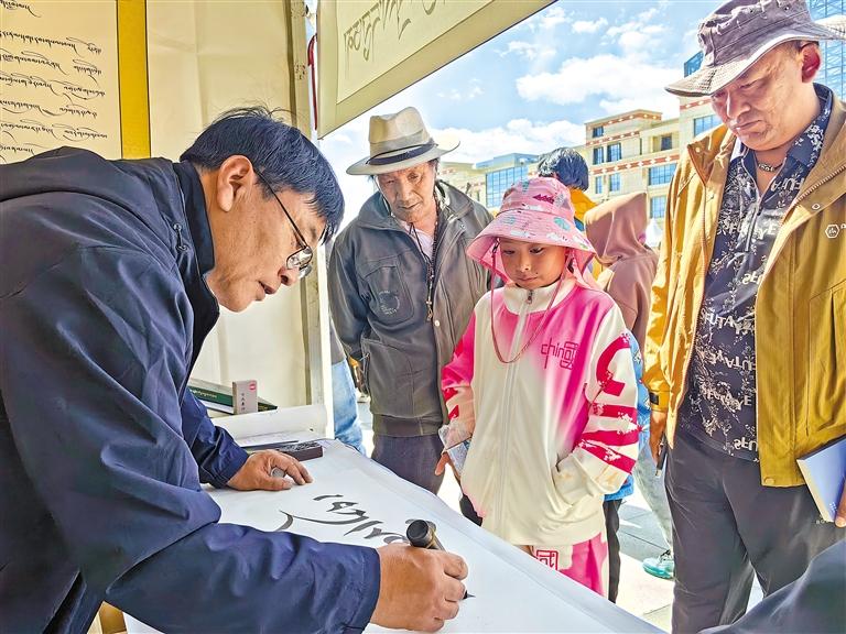 在那曲市團結(jié)廣場,群眾感受藏文書法魅力。記者 趙書彬 攝