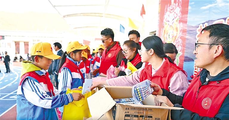圖為志愿者在向?qū)W生們分發(fā)學(xué)習(xí)用品。記者 丹增平措 攝