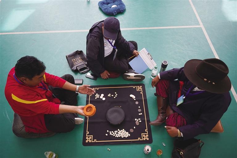 當(dāng)日,“吉韌”“秀茲”等項(xiàng)目一同開賽。 “吉韌”也叫藏式克郎球,是藏族的一種彈指運(yùn)動(dòng)。比賽在一張邊長(zhǎng)約1米的正方形木桌球臺(tái)上進(jìn)行,球臺(tái)四角有4個(gè)小洞,黑、白兩種扁圓形球子各9個(gè),另有1個(gè)紅色球子放置在球臺(tái)中心,1個(gè)白色母球供雙方彈擊球子所用。