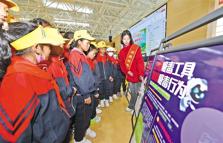 志愿者為拉薩市尼木縣小學(xué)師生講解禁毒知識(shí)。記者 唐斌 攝