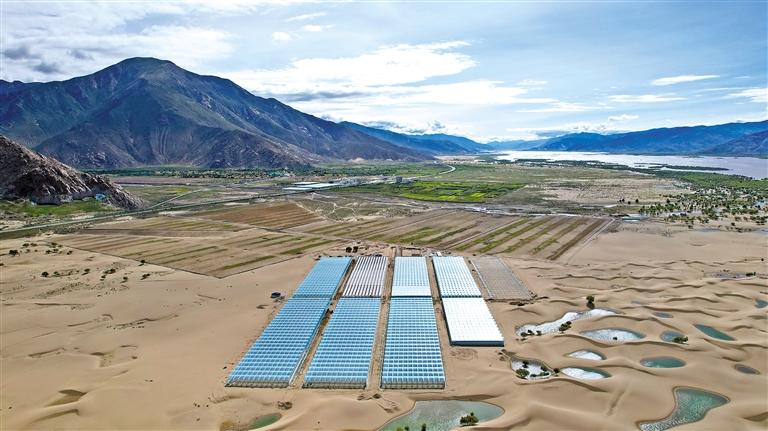 國(guó)家農(nóng)業(yè)產(chǎn)業(yè)化示范企業(yè)——西藏綠之源現(xiàn)代農(nóng)業(yè)科技股份有限公司二期項(xiàng)目,如同一片“綠洲”鑲嵌在沙丘之中。