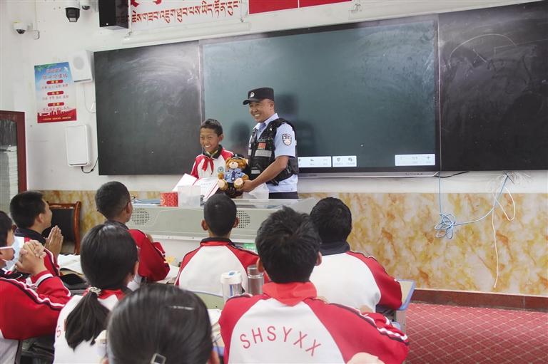 民警利用課間休息時(shí)間向次仁扎西頒發(fā)印有“拾金不昧、品德高尚”的榮譽(yù)證書(shū)并送上“警察小熊”。圖由桑珠孜公安提供