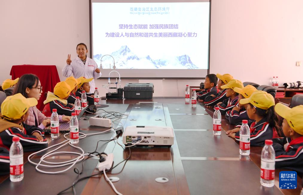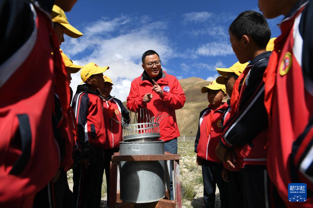 9月5日,在珠穆朗瑪大氣與環(huán)境綜合觀測研究站,西藏自治區(qū)生態(tài)環(huán)境監(jiān)測中心工程師索娜卓嘎為學(xué)生們科普生態(tài)環(huán)境監(jiān)測意義。新華社記者 張汝鋒 攝