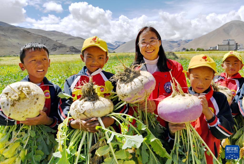 9月5日,在珠峰腳下的田地里,中國科學(xué)院青藏高原研究所副研究員、中國生態(tài)學(xué)學(xué)會(huì)高寒生態(tài)專業(yè)委員會(huì)委員姜麗麗(中)和學(xué)生們一起展示收獲的蕪菁。新華社記者 張汝鋒 攝