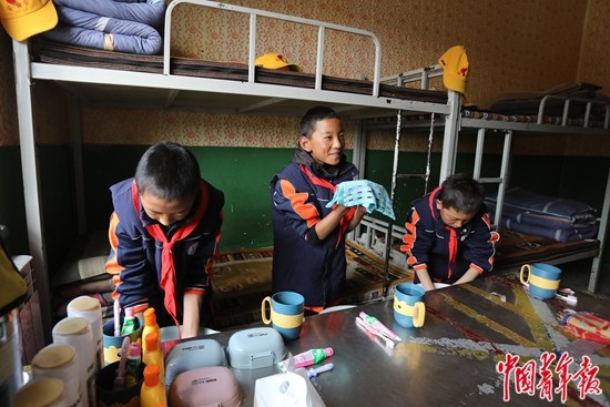 9月14日,西藏那曲市班戈縣第二(中石化)小學,學生們午休后在宿舍里洗漱。部分離家較遠的學生,可以選擇讀書期間全程住校,生活起居都有專門的老師照顧。中青報·中青網記者 孔斯琪 攝