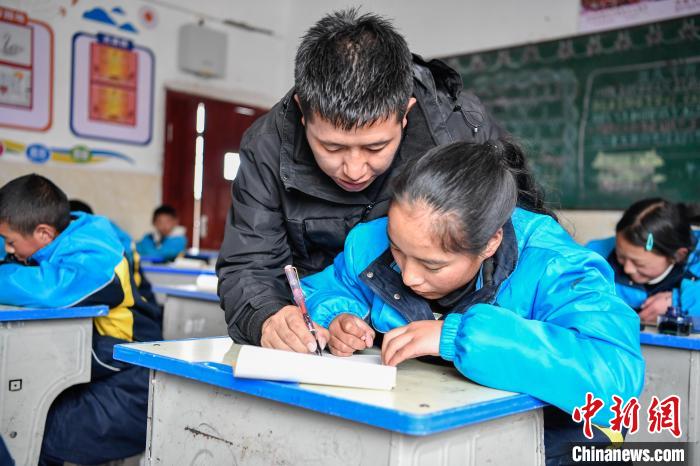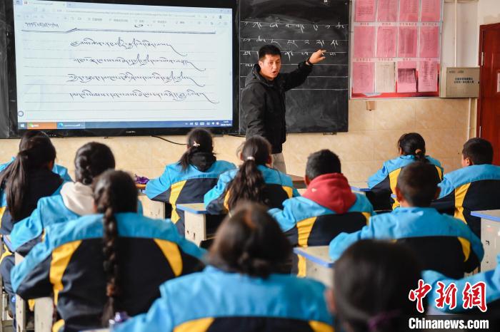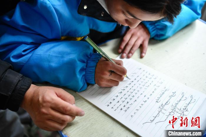 10月25日,在西藏自治區(qū)那曲市聶榮縣中學(xué),學(xué)生在老師的帶領(lǐng)下學(xué)習(xí)藏文書(shū)法。中新社記者 貢嘎來(lái)松 攝