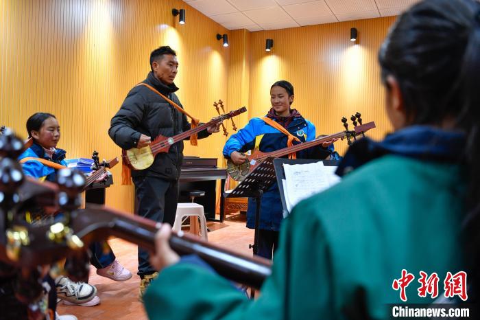 10月25日,在西藏自治區(qū)那曲市聶榮縣中學(xué),學(xué)生在老師的帶領(lǐng)下學(xué)習(xí)扎念琴。中新社記者 貢嘎來(lái)松 攝