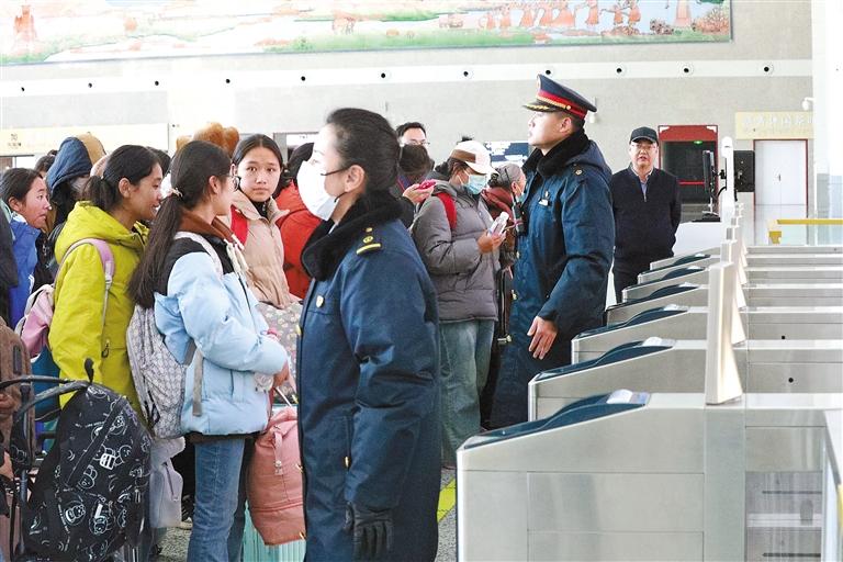 圖為山南火車(chē)站工作人員在檢票口維持秩序。記者 張琳 攝
