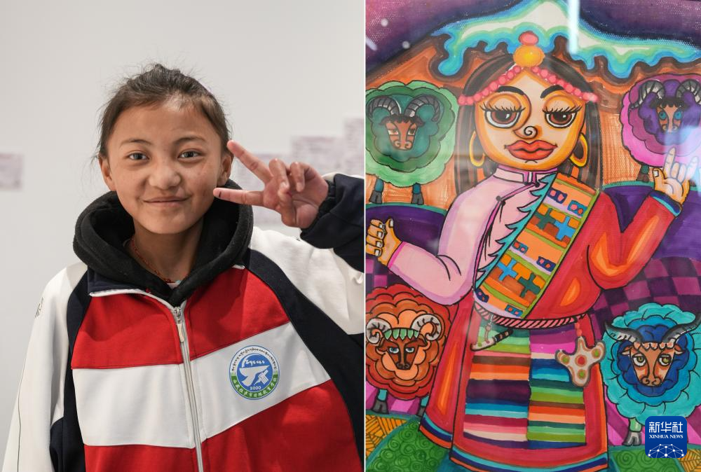 4月19日拍攝的拉薩市特殊教育學校13歲的聽障學生白瑪次仁和她的作品《放羊的小卓瑪》(拼版照片)。新華社記者 晉美多吉 攝