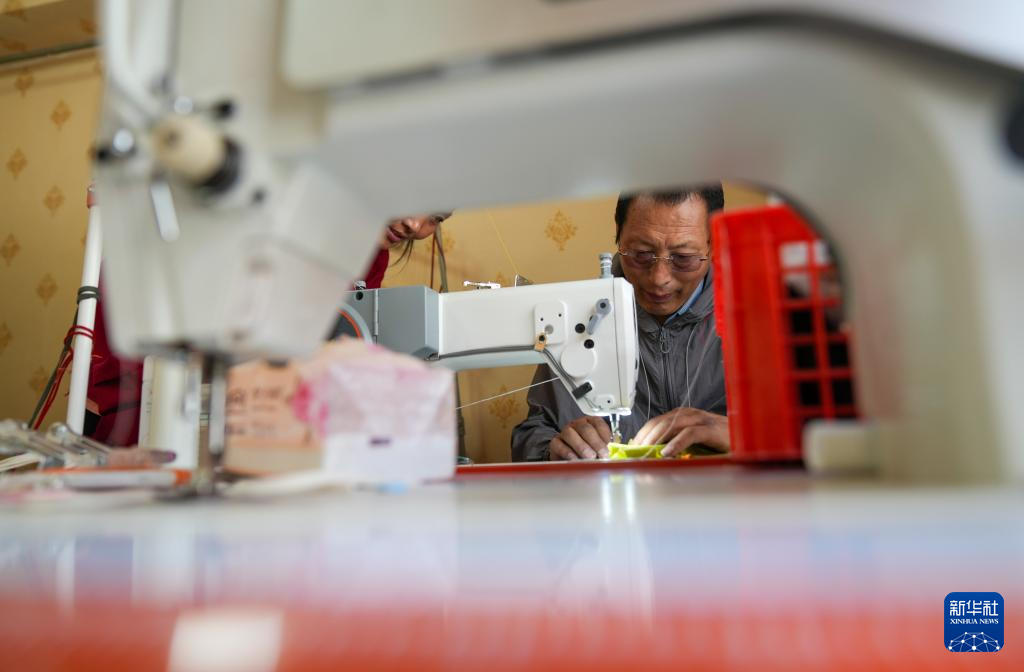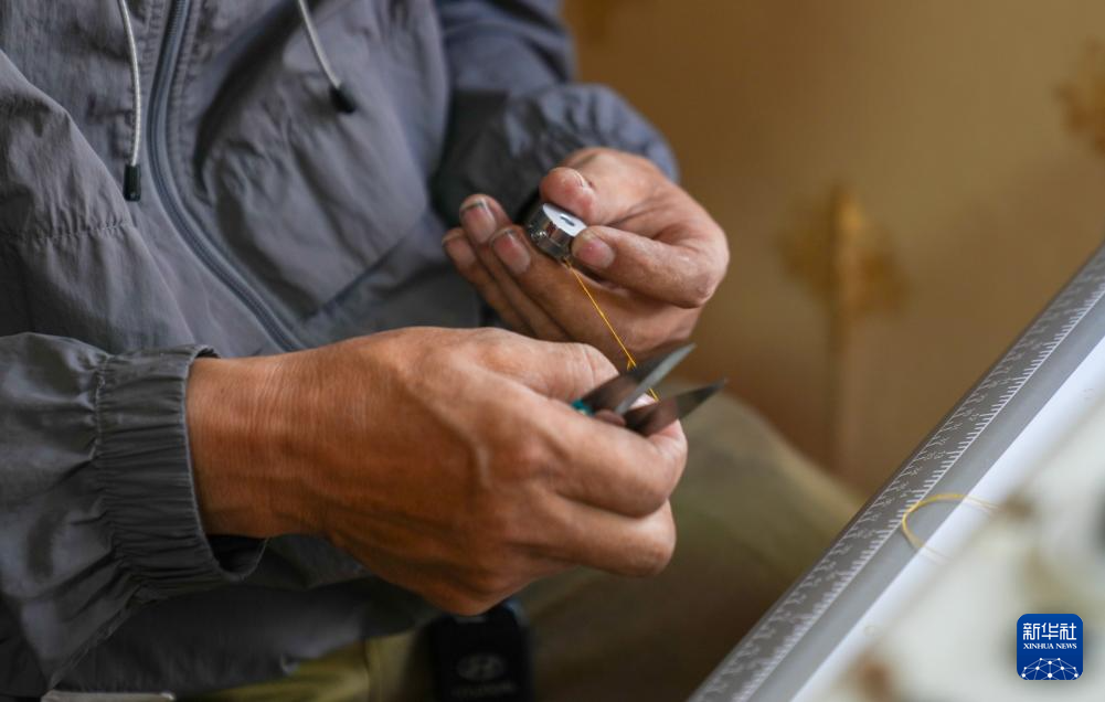 洛桑麥朗來(lái)到畢業(yè)學(xué)生開(kāi)設(shè)的店鋪,現(xiàn)場(chǎng)示范制衣過(guò)程中的細(xì)節(jié)(8月15日攝)。新華社記者 晉美多吉 攝