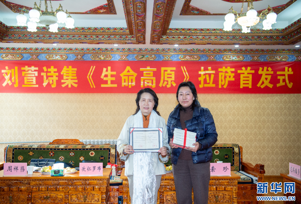 1月15日,在活動(dòng)現(xiàn)場(chǎng)劉萱向西藏自治區(qū)作協(xié)、西藏自治區(qū)圖書館捐贈(zèng)了《生命高原》詩集。新華網(wǎng) 旦增努布 攝