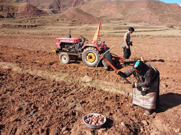 在充分調(diào)研的基礎(chǔ)上,嘎瑪澤加從本村實(shí)際出發(fā),積極爭(zhēng)取項(xiàng)目、資金支持,于2014年起牽頭在全村推廣紅土豆和藍(lán)青稞特色產(chǎn)業(yè)種植工作。經(jīng)過(guò)不斷努力,成功將覺(jué)恩村紅土豆種植面積擴(kuò)大到1200畝、藍(lán)青稞1000畝,這兩項(xiàng)種植業(yè)每年為群眾創(chuàng)收430萬(wàn)元,使群眾看到了發(fā)展特色種植產(chǎn)業(yè)帶來(lái)的實(shí)實(shí)在在的經(jīng)濟(jì)效益。