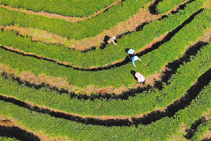 氣溫回暖,蟄伏了一個冬天的春茶早已迫不及待地吐出新綠。一片片小小的茶葉是村民手中的“金葉子”,一壟壟整齊的茶園成為當?shù)厝罕姷摹熬蹖毰琛?,它們撐起了農(nóng)民增收、農(nóng)村富裕、脫貧攻堅的一方天地。