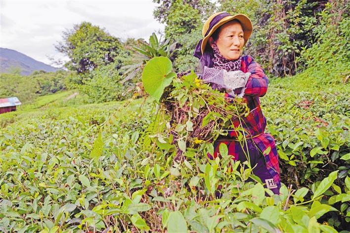 圖為墨脫縣背崩鄉(xiāng)背崩村村民在茶場(chǎng)給茶樹(shù)修剪枝葉。記者 張猛 通訊員 王顯琴 攝
