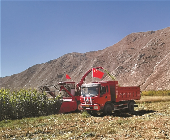 上午11時,收割工作緊張有序進行,多臺青貯收割機開足馬力在田地里奔忙。在齒輪的旋轉下,青貯玉米自動收割、粉碎、裝進運輸車,空氣中混合著濃郁清新的草香味,到處是一派繁忙的收獲景象,這為全區(qū)牦牛越冬儲備下了充足的“口糧”。