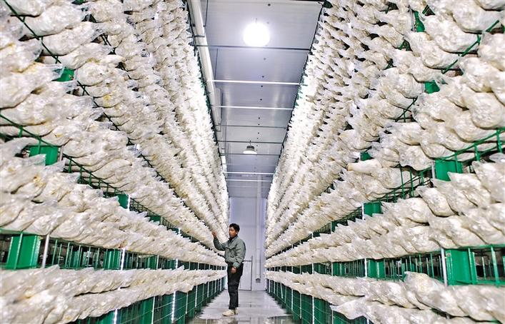 圖為園區(qū)工作人員查看食用菌長勢情況。記者 唐斌 次旺 攝
