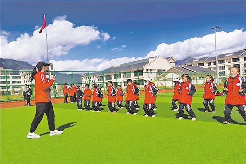 西藏林芝市巴宜區(qū)八一鎮(zhèn)團(tuán)結(jié)小學(xué)操場(chǎng)上,來(lái)自廣東的援藏教師正在向?qū)W生教授跆拳道。經(jīng)濟(jì)日?qǐng)?bào) 記者 龐彩霞