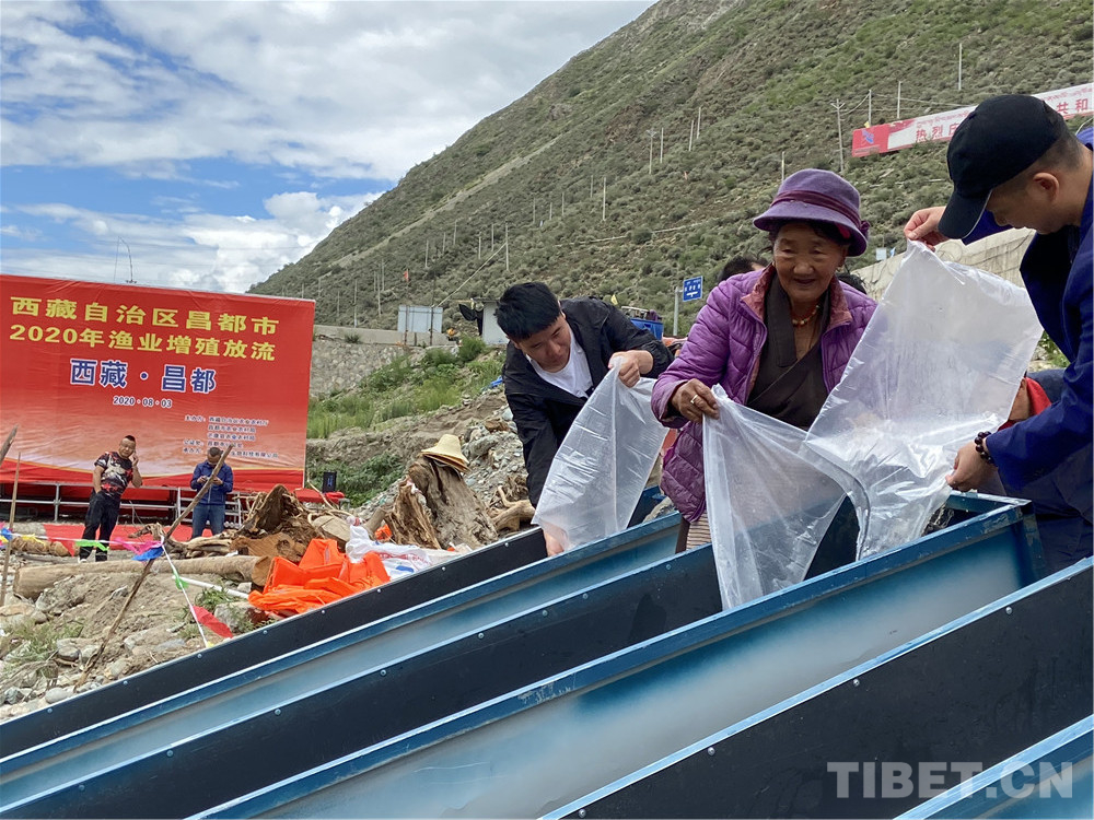 在工作人員協(xié)助下,老阿媽把一袋袋魚苗放入江中。據(jù)老阿媽說,當年十八軍進藏路過這里,帶的糧食不多,他們不向當?shù)厝苏骷Z,有些人餓得浮腫。江河中的魚兒好抓,但沒有一個戰(zhàn)士違反紀律去抓魚。藏族敬畏魚,不捕魚,不吃魚。解放軍尊重當?shù)仫L俗,即使餓死也不抓魚充饑。