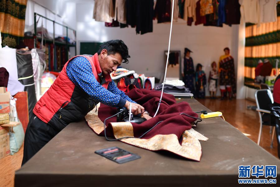 在西藏昌都市江達(dá)縣格桑花民族服飾加工銷售公司,江達(dá)縣字嘎鄉(xiāng)塔字村村民扎西江措在制作藏裝(4月30日攝)。扎西江措學(xué)習(xí)制作藏裝不到兩年時(shí)間,已經(jīng)是一名熟練的制衣工,現(xiàn)在每個(gè)月有4000多元的收入。新華社記者 詹彥 攝