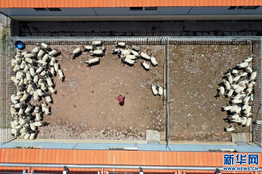 在西藏昌都市貢覺縣莫洛鎮(zhèn)阿旺綿羊繁育基地,阿果村村民色秋在查看綿羊的生長(zhǎng)情況(5月2日攝,無(wú)人機(jī)照片)。2016年,色秋來(lái)到阿旺綿羊繁育基地打工,很快就學(xué)會(huì)了綿羊的養(yǎng)殖技術(shù),現(xiàn)已成為繁育基地的一把好手,月工資漲到了4400元。新華社記者 詹彥 攝