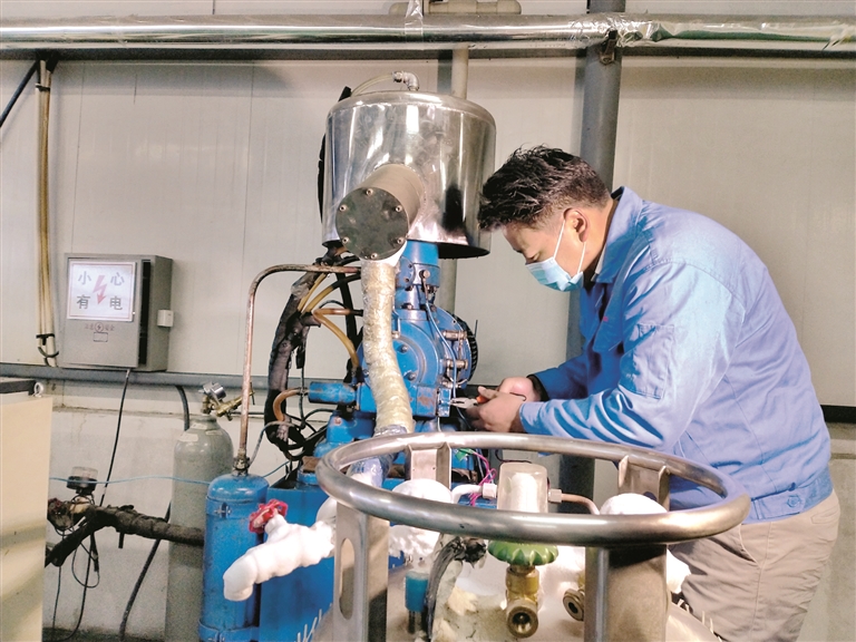 圖為拉瓊在檢修液氮機(jī)。拉薩融媒記者 莫瑞英攝